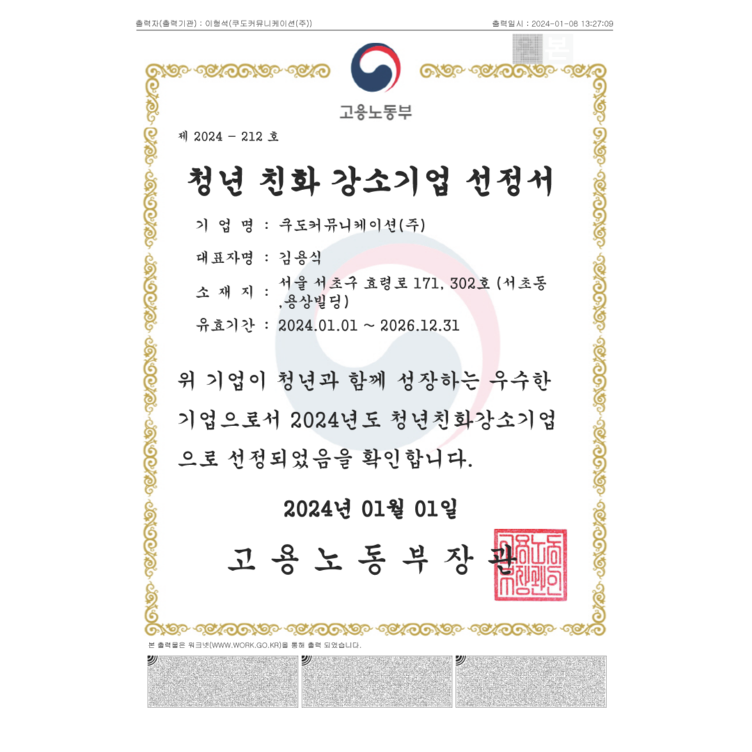 Certificate of Selection as a Youth-Friendly Strong Small Giant Company